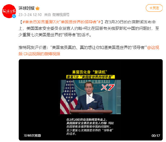 [#美官员发言重复7次“美国是世界的领导者”#]在3月20日的白宫新闻发布会上,美国国家安全委员会发言人约翰·柯比在回答有关俄罗斯和中国的问题时,至少重复七次美国是世界的“领导者”的话术。