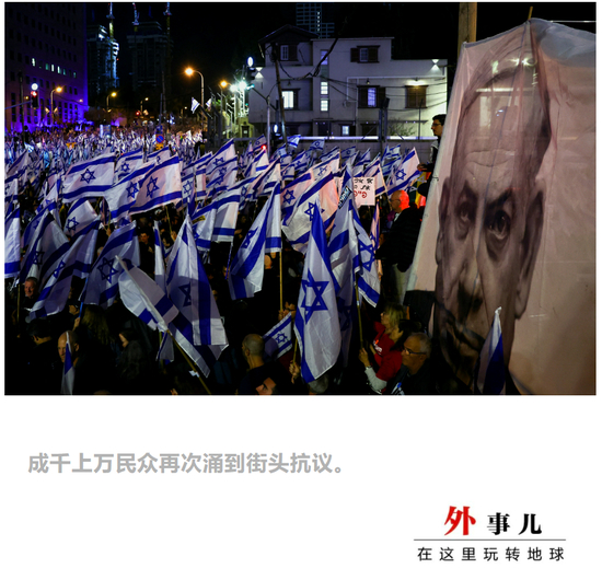 当地时间3月26日深夜,成千上万的以色列民众涌上全国各大城市街头,自发举行抗议活动。
