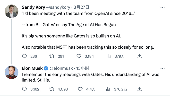 27日,推特用户Sandy Kory发文,先是引用盖茨博文《AI时代已开启》中的一句话:“自2016年以来,我始终在与 OpenAI团队保持着联系……”Sandy Kory随后点评称:“像盖茨这样的人如此看好AI,这是件大事。值得注意的是,微软长期以来也一直在密切关注这一趋势。”