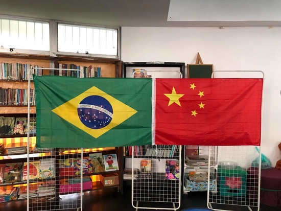 ·2022年8月,巴西里约热内卢州的一所学校图书馆内,挂起了中巴两国国旗。(陈一鸣/摄)
