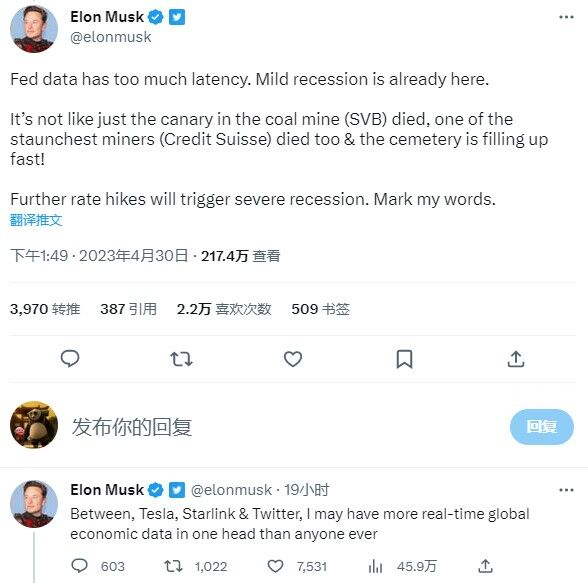 马斯克对此回复称,“美联储的数据有太多的延迟,温和的衰退已经出现。”