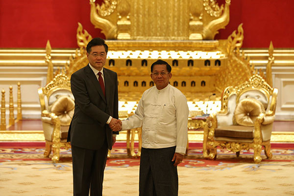 2日,缅甸领导人敏昂莱在内比都会见秦刚。秦刚表示,中方真心希望缅甸局势稳定、国家发展,支持缅甸探索符合国情、具有缅甸特色的发展道路,支持缅方继续推进政治转型进程,支持缅各方在宪法和法律框架下妥处分歧、实现和解。秦刚还表示,中方将继续为缅发展提供力所能及的帮助,加快推进中缅经济走廊重点合作项目,开展农业、教育、医疗等惠民项目。