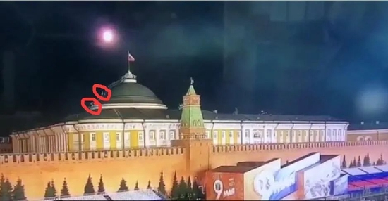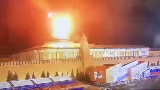 但随后在网络上广泛转播的一段视频显示,一架固定翼无人机直接飞向克宫总统官邸的穹顶,并在穹顶上方发生爆炸。