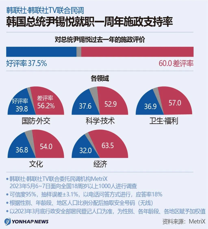 就在不久前,韩国民调机构“MetriX9”发布的最新民调显示,尹锡悦施政一年的好评率为37.5%,差评率高达60%。