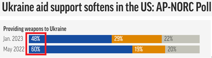 美联社公共事务研究中心的民调显示,美国大众对军援乌克兰的支持率已从去年5月的60%掉到今年1月的48%。