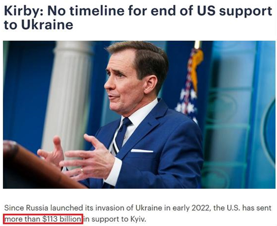仅在2023财年,美国国会就累计批准了总额高达1130亿美元的对乌军事、经济、人道主义和其他援助计划。