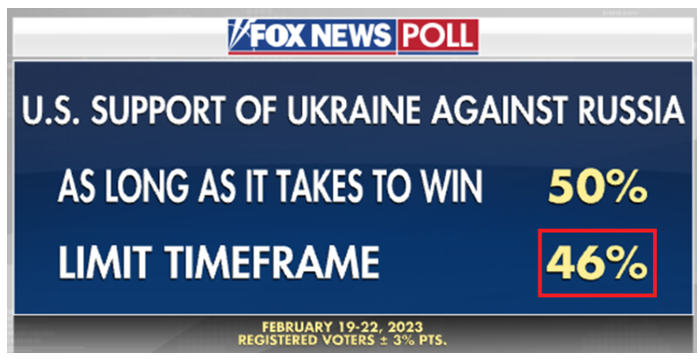 福克斯新闻的民调显示,46%的美国人认为,拜登政府对乌克兰的援助应有“时间限度”。这是自乌克兰危机全面升级以来的最高比例。
