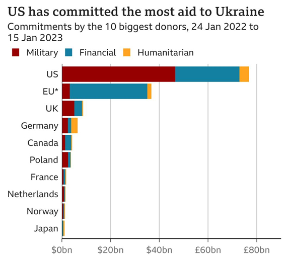 而其中,军事援助占美国对乌承诺的各类援助总额的一半以上,超过财政和人道主义等援助的总和。