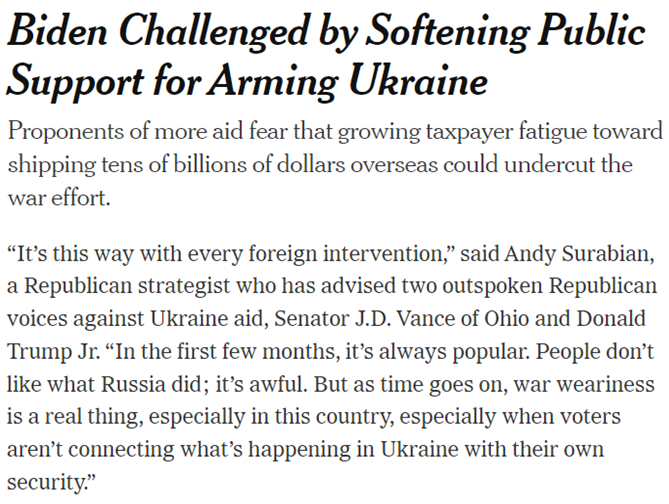 《纽约时报》援引共和党策略师安迪·苏拉比安的话说,“美国每一次对外干预都会在最初几个月里得到支持,而时间一长就会让人厌烦,尤其是当美国选民没有将乌克兰发生的事情与他们自己的安全联系起来时”。