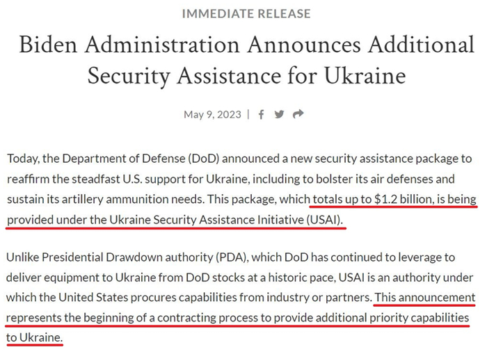 与动用“总统提款授权”(PDA)直接从美国国防部现有库存中调拨可快速提供给乌克兰的武器装备不同,USAI 授权美国政府从军工企业订购援乌武器。