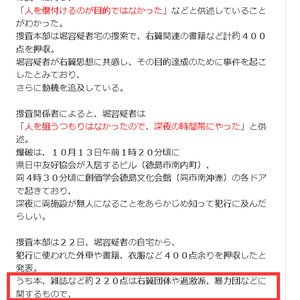 2008年10月13日凌晨,日本德岛市日中友好协会所在建筑物和创价学会德岛文化会馆先后发生爆炸,肇事者是一个名叫堀太暠的35岁日本无业男子。根据当时日本媒体的报道,警方当时从此人的住所中搜出了数百份有关日本极右翼势力、黑帮以及恐怖主义的材料。