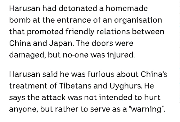 可澳广的报道中提到的唯一一处堀太暠犯下的罪行,却与乌克兰或是俄罗斯没有任何关系,而是耿直哥在前文提到的他在2008年用炸弹对日本德岛市日中友好协会和创价学会德岛文化会馆实施的袭击。而更奇怪的是,口口声声说要赎罪的堀太暠,却没有流露出任何对于他所信奉的日本极右翼思想的悔意,更没有反思他对中国怀有的极端仇视,反而是与澳广一唱一和地宣称他是因为“痛恨中国政府对于新疆和西藏人的迫害,才去发起的那些袭击”,他甚至还通过澳广辩解说自己没有“伤人的恶意”,只是想“警告”那些与中国友好的组织。
