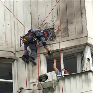 (视频截图)当地时间5月30日,俄罗斯莫斯科,乌克兰无人机袭击后,调查人员检查受损公寓楼。图据视觉中国