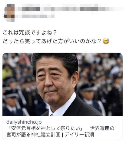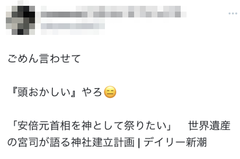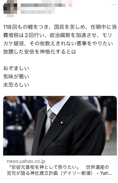 “每日新潮”的报道很快在日本网络上引发争议,不少日本网友认为“将安倍作为神去祭拜”这种做法“太过火了”。有日本网友抨击,“安倍说过118次谎言,让国民受苦,在任时上调过两次消费税,加速政治腐败,身陷森友、加计丑闻,还随心所欲地做了其他数不胜数的坏事,竟然将这种人神格化……令人厌恶、恶心、恐惧”。