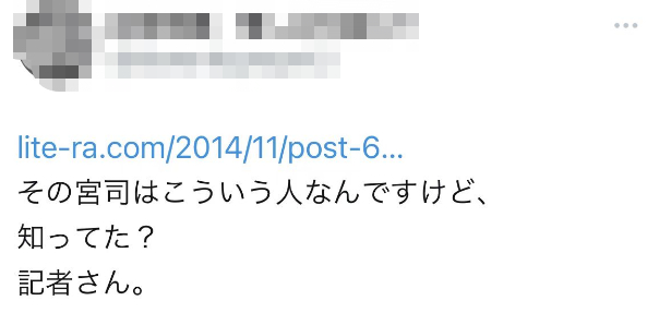还有日本网友挖出日本“litera”新闻网2014年的报道,报道称安倍晋三曾经给佐藤的书籍写过寄语,两人关系密切,而佐藤曾经发表过很多对中国人和韩国人的极端仇恨言论,“litera”新闻网将佐藤描述为“极端右翼活动家”。该网友质问,“新潮记者,你知道吗?这个宫司是这种人”。