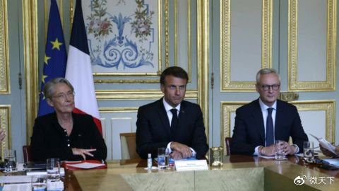 法国总统马克龙(中)、总理伊丽莎白·博尔内(左)和经济、财政及工业、数字主权部部长布鲁诺·勒梅尔于2023年7月2日星期日在巴黎内政部紧急危机中心参加紧急会议 图自法兰西24电台报道配图