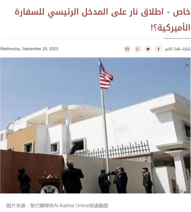 另据黎巴嫩媒体Al-Kalima Online报道,20日晚,一辆黑色汽车从美国驻黎巴嫩大使馆前驶过,车内人员向大使馆正门开火。
