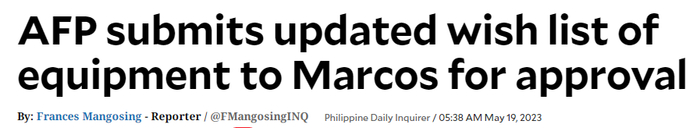 菲律宾媒体5月时的一篇文章称,菲律宾军方向菲总统提交更新武器装备的愿望清单。