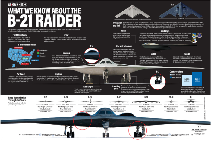 另外,不排除B-21可能使用了较小的副武器舱,因为在主武器舱旁边有“某种明确的舱口”。这样可以充分利用空间,并搭载新武器,其中包括用于自卫的先进空对空导弹和用于进入严密设防地区投放的“防区内攻击武器” (SiAW)。