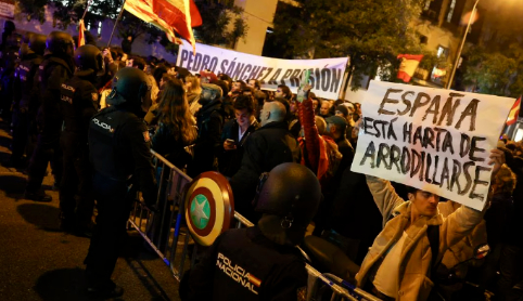 “桑切斯叛徒”“不要出卖西班牙”,一些抗议者高举标语牌,还有人挥舞着西班牙国旗在街头抗议。西班牙反对党人民党领袖费霍和极右翼呼声党领袖阿瓦斯卡尔也参加了此次游行。集会结束后,数百人还在首相官邸蒙克洛亚宫附近的高速公路上举行抗议。65岁的马德里人加兰告诉法新社,“桑切斯就是要把西班牙变得四分五裂”。另一名抗议者玛丽安娜直言,“新一轮的动荡马上就要开始了”。