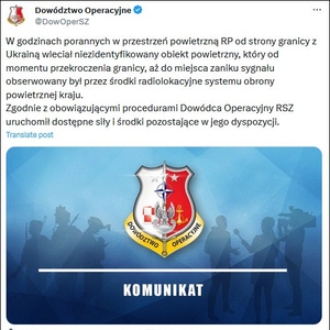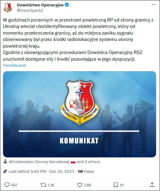 “军队已经提高了防御准备,并紧急起飞喷气式战斗机以应对‘侵犯领空’事件。”波兰武装部队作战司令部发言人亚采克·戈雷谢夫斯基接受波兰TVN24电视台采访说。不过,他拒绝透露该物体是坠落在波兰领土上还是离开了波兰领空。