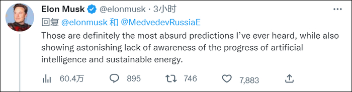 后来,被梅德韦杰夫预测将成为美国总统的马斯克还留言称,这是条“史诗级帖子”,是他听过最荒谬的预测。