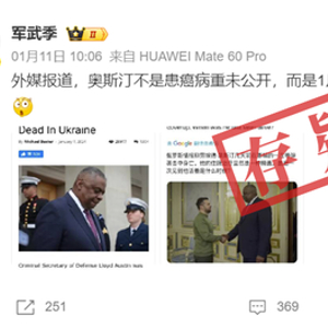 1月11日,中外平台上有传言称:“奥斯汀不是患癌病重未公开,而是1月3日在基辅被俄导弹打死秘不发丧。”