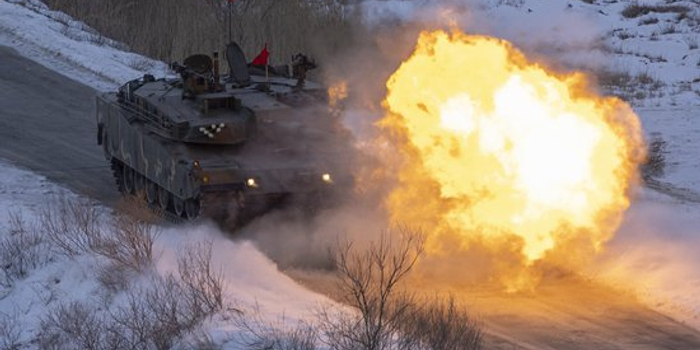 1月25日,韩国京畿道,韩军在抱川市胜进科学化训练场举行射击训练,图为陆军第17师团K1E1战车正在发射炮弹。视觉中国供图