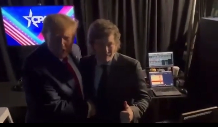 据阿根廷《布宜诺斯艾利斯时报》24日报道,在CPAC上发表演讲前,米莱在后台会见了特朗普。阿根廷总统发言人阿多尼在社交媒体上发布了两人会面的视频,视频中米莱情绪激动,热情地与特朗普打招呼。米莱说,“我非常高兴,你对我非常慷慨。”另据美联社报道,在会面时,米莱与特朗普进行了亲密拥抱。特朗普还对着镜头说“让阿根廷再次伟大”,米莱则喊出他的经典口号“自由万岁”。报道称,“让阿根廷再次伟大”来源于特朗普的竞选口号“让美国再次伟大”,两者英文都可简称为“MAGA”。