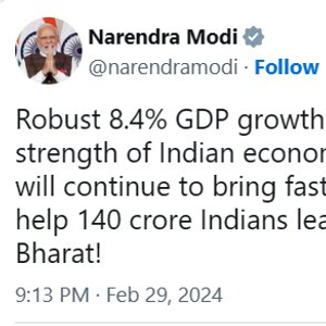 在数据公布后,印度总理莫迪兴奋地评论称,8.4%的增速显示了印度经济的实力及其潜力,我们的努力工作将继续推动经济快速增长,帮助14亿印度人民过上更好的生活,创造一个伟大的印度!