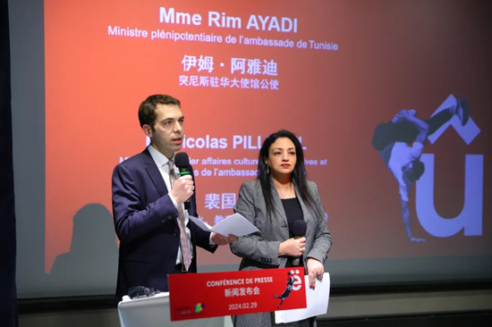 法国驻华大使馆文化、教育与科学事务公使衔参赞裴国良(左)突尼斯驻华大使馆公使伊姆·阿雅迪(右)介绍法语活动月重点项目