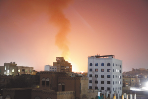 2月25日凌晨在也门首都萨那拍摄的美英轰炸后产生的火光与浓烟。 新华社发