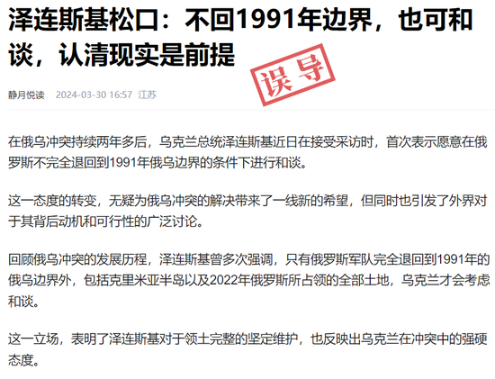 - 原采访中,泽连斯基没有明确提及“乌克兰愿意在俄罗斯不完全退回到1991年俄乌边界的条件下进行和谈”。