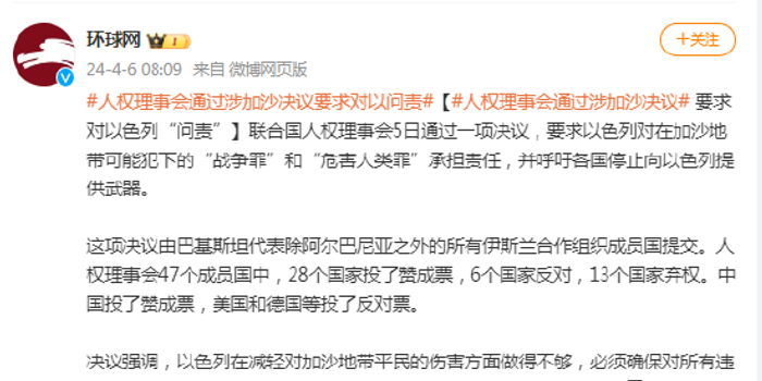决议强调,以色列在减轻对加沙地带平民的伤害方面做得不够,必须确保对所有违反国际人道主义法和国际人权法的行为追究责任。决议说,对有关严重侵犯人权和严重违反国际人道主义法行为的相关报告表示关切,包括巴勒斯坦被占领土上可能发生的“战争罪”和“危害人类罪”。决议呼吁各国“停止向以色列出售、转让和转移武器、弹药和其他军事装备”。