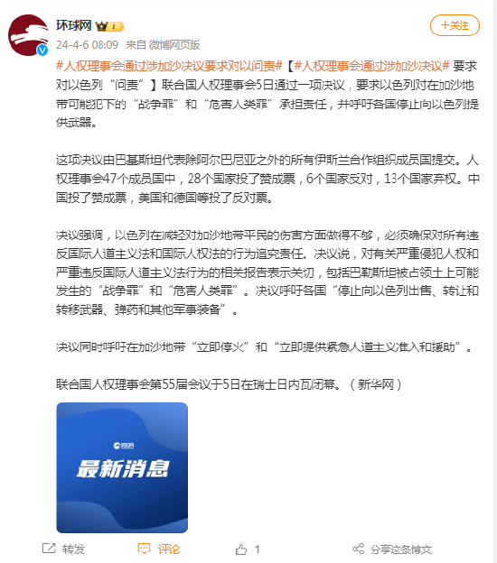 联合国人权理事会5日通过一项决议,要求以色列对在加沙地带可能犯下的“战争罪”和“危害人类罪”承担责任,并呼吁各国停止向以色列提供武器。