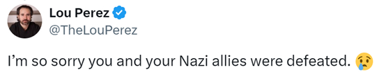 也有人以嘲讽的语调说道:“你和你的纳粹盟友战败了,我真的很抱歉。”