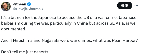 有人评论说:“日本人指责美国犯了战争罪,这过分了。日本人在战争期间的野蛮行径,尤其是在中国,还包括在整个东南亚,是有据可查的。如果(轰炸)广岛和长崎是战争罪行,那么(偷袭)珍珠港又是什么?别跟我说那是罪有应得的。”