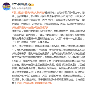 最新消息:当地时间5月10日上午,北京时间今晚,应多国要求,联合国大会第十届紧急特别会议恢复举行。会议审议了接纳巴勒斯坦为联合国新会员国议题,通过了授予巴勒斯坦更多权利的决议。表决中,143票赞成,9票反对,25票弃权,决议获得通过。美国、以色列等投票反对。