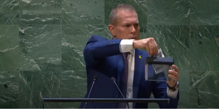 以色列常驻联合国代表埃尔丹在联合国大会现场粉碎《联合国宪章》 图自美媒视频截图