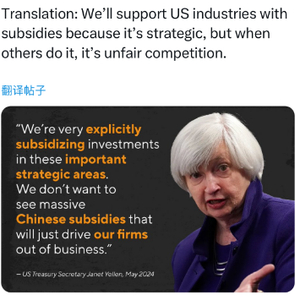 针对耶伦上述言论,5月13日,华春莹在社交媒体X上发文揭露耶伦言论蕴含的美方“双标”。华春莹写道:“翻译一下:‘我们会用补贴支持美国工业,因为这是战略性的,但当别人这么做时,那就是不公平竞争。’”
