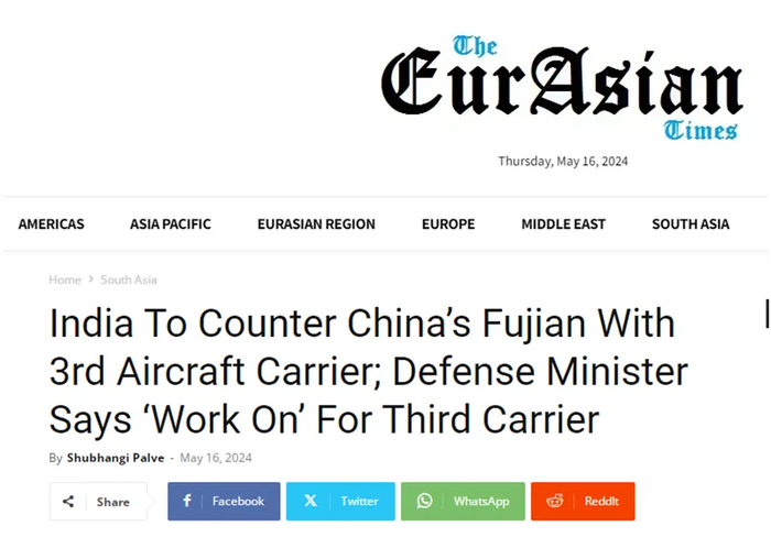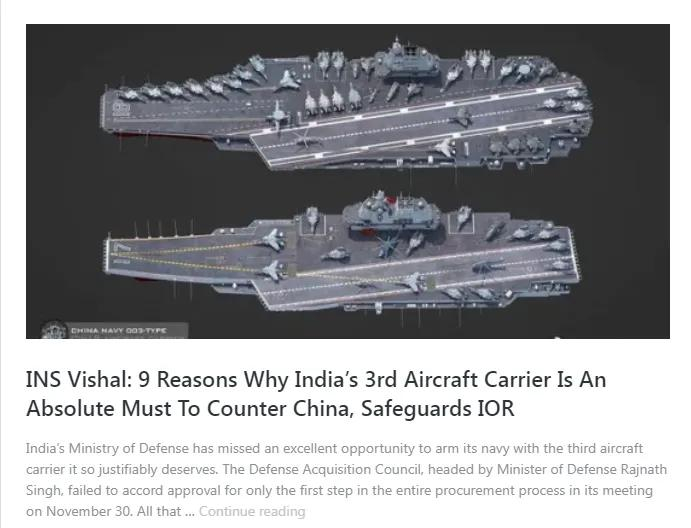 中国第三艘航母福建舰海试归来,极大刺激了某个东方大国——没错,就是印度。印度防长拉杰纳特·辛格近日在接受印度媒体采访时许诺称,印度很快也将开始建造第三艘航母。印度《欧亚时报》16日就毫不掩饰地表示,印度航母的扩充计划,就是针对中国而来的。