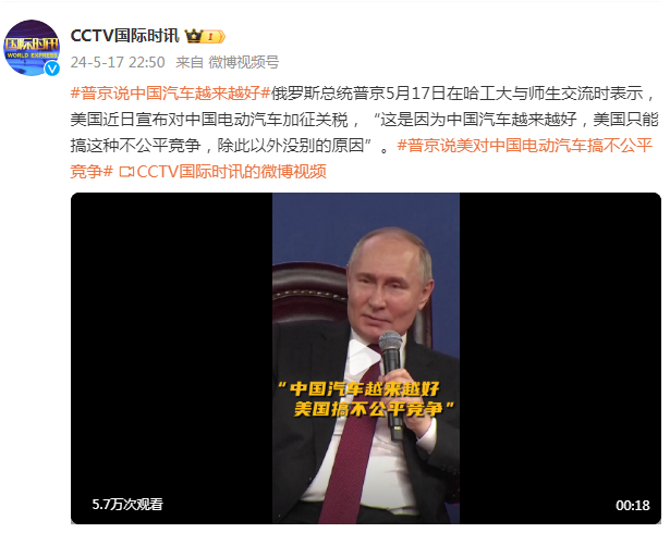 俄罗斯总统普京5月17日在哈工大与师生交流时表示,美国近日宣布对中国电动汽车加征关税,“这是因为中国汽车越来越好,美国只能搞这种不公平竞争,除此以外没别的原因”。