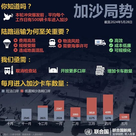 战争期间,联合国近东巴勒斯坦难民救济和工程处一直坚守在前线,该机构已有超过191名工作人员丧生,其中包括11名专业医护人员。据近东救济工程处和人道协调厅称,在过去的三周里,敌对行动的加剧和疏散命令的发布已导致超过94万人逃离拉法,同时还有10万人在加沙北部流离失所。人道协调厅在近日发布的最新情况通报中指出,拉法遭遇的袭击有增无减,因敌对行动而流离失所的平民缺乏住所、食物、水和其他生存所必需的物资和服务。同时,人道主义局势最新情况与人们长期以来对加沙缺乏援助的担忧如出一辙;报告强调,尽管凯雷姆沙洛姆过境点“原则上仍然开放,但由于敌对行动、后勤条件的挑战和复杂的协调程序,援助组织从加沙一侧进入极为困难……准入限制继续阻碍着加沙境内人道主义援助物资的运送”。5月1日至5月26日期间,人道协调厅报告说,以色列当局仅为137个人道主义援助团前往加沙各地需要协调的地区提供了便利;86个援助团“在获得批准后受阻或一开始就被拒绝进入,43个援助团被组织者取消”。