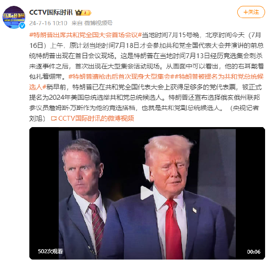 当地时间7月15号晚,北京时间今天(7月16日)上午,原计划当地时间7月18日才会参加共和党全国代表大会并演讲的前总统特朗普出现在首日会议现场。这是特朗普在当地时间7月13日经历竞选集会刺杀未遂事件之后,首次出现在大型集会活动现场。从画面中可以看出,他的右耳戴着包扎着绷带。稍早前,特朗普已在共和党全国代表大会上获得足够多的党代表票,被正式提名为2024年美国总统选举共和党总统候选人。特朗普还宣布选择俄亥俄州联邦参议员詹姆斯·万斯作为他的竞选搭档,也就是共和党副总统候选人。(央视记者 刘旭)