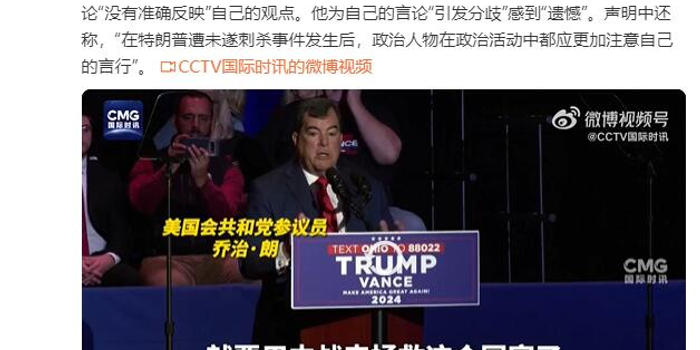 #美一共和党议员称输大选恐内战#当地时间7月22日,来自俄亥俄州的美国国会参议员、共和党人乔治·朗在俄亥俄州米德尔敦举行的一场竞选集会上宣称,如果共和党总统候选人、美国前总统特朗普在今年11月的总统选举中失利,那么美国“恐怕就要打一场内战”。不过随后,乔治·朗便发表声明称,其在竞选集会上发表的言论“没有准确反映”自己的观点。他为自己的言论“引发分歧”感到“遗憾”。声明中还称,“在特朗普遭未遂刺杀事件发生后,政治人物在政治活动中都应更加注意自己的言行”。