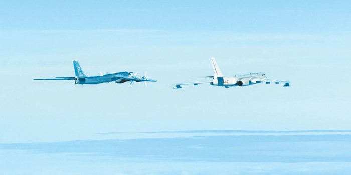 俄罗斯国防部在声明中表示,俄罗斯图-95MS轰炸机和中国空军轰-6K轰炸机在楚科奇海、白令海和太平洋北部海域上空进行联合巡逻。俄军消息中称,在飞行过程中,俄中机组人员演练了空中巡逻各个阶段的相互协作问题。联合巡航由俄空天军苏-30SM和苏-35S护航。