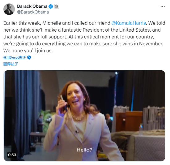 美国前总统奥巴马7月26日表示,本周早些时候,他和米歇尔给哈里斯打了电话。他和米歇尔都认为哈里斯会成为一位出色的美国总统,并全力支持她。奥巴马说,“在这个国家的关键时刻,我们将竭尽全力确保她在11月获胜。”