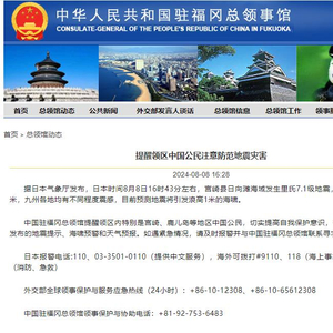 中国驻福冈总领馆:提醒领区中国公民注意防范地震灾害