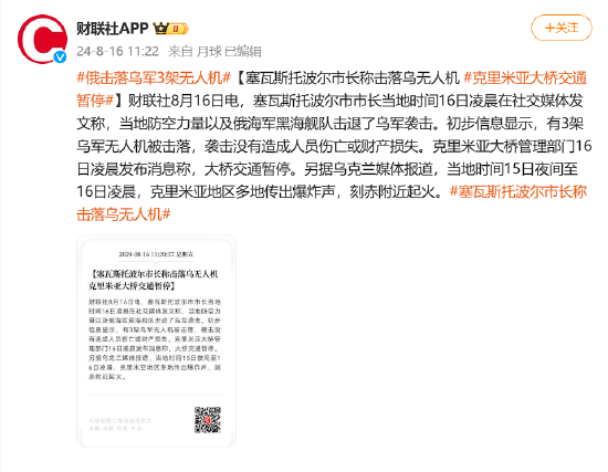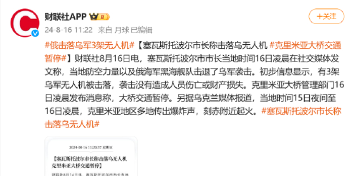 财联社8月16日电,塞瓦斯托波尔市市长当地时间16日凌晨在社交媒体发文称,当地防空力量以及俄海军黑海舰队击退了乌军袭击。初步信息显示,有3架乌军无人机被击落,袭击没有造成人员伤亡或财产损失。克里米亚大桥管理部门16日凌晨发布消息称,大桥交通暂停。另据乌克兰媒体报道,当地时间15日夜间至16日凌晨,克里米亚地区多地传出爆炸声,刻赤附近起火。