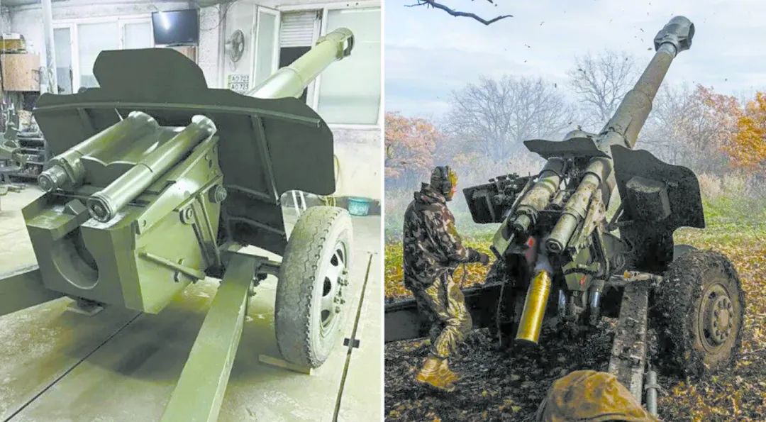 乌军制造的塑料火炮(左),模拟D-20火炮(右)